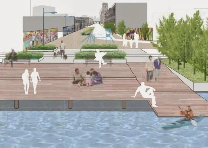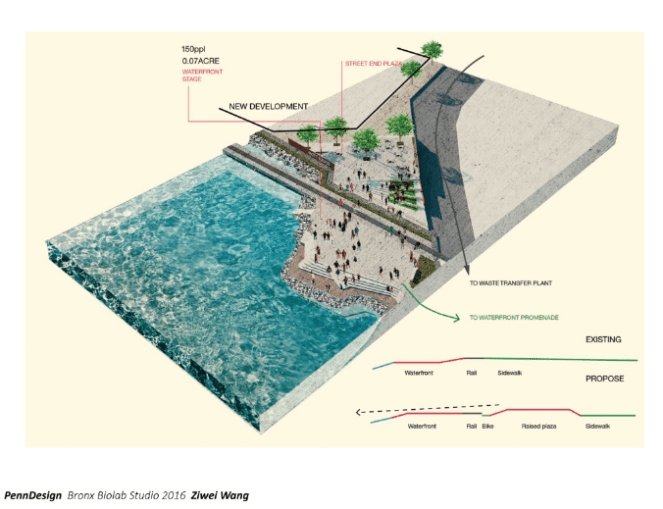 This site is proposed to encompass Lincoln Avenue to Alexander Avenue from East 132nd Street to the Harlem River. This site is already being used as an ad hoc fishing site and is easily accessible by pedestrians. It provides direct access to the waterfront, and in a recent project conducted by Meta Local Collaborative, community residents expressed overwhelming enthusiasm for using this space for relaxation, celebrations, and recreation. MIT produced a plan for this waterfront site; see page 68 here, and renderings such as the above have been prepared by local architects and other subsequent academic institutions. This site is also important because it is in a flood zone of a SMIA and was impacted by Hurricane Sandy with upwards of three+ feet of flooding. This proposal can help mitigate the effects of climate change and potential flooding of industry and waste transfer stations along the waterfront in the future. It is also within an area proposed to be eliminated from SMIA designation and is included in Vision 2020. The site is also included in the NYC Parks Department Harlem River Watershed and Natural Resources Management Plan for the Bronx.
